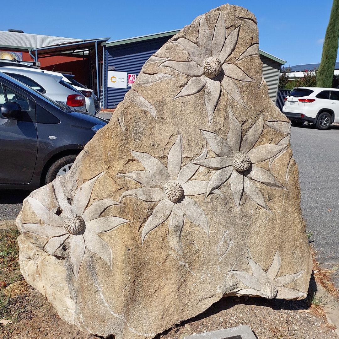 Continuing north along Swanport Road cyclists will come across a remarkable limestone flannel flower sculpture adjacent to the Murray Bridge hospital’s Our Wellbeing Place.