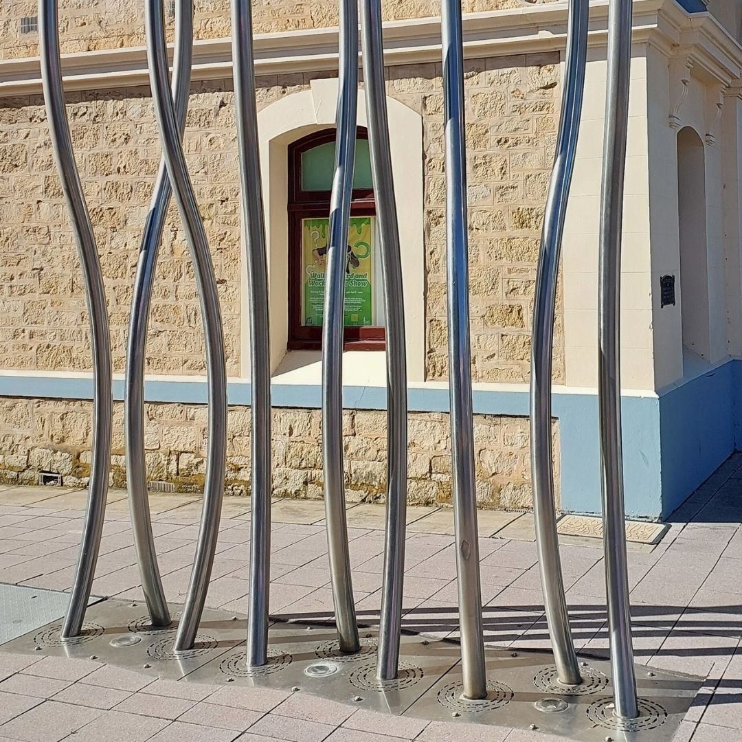 On the bike again heading back to Bridge Street, cyclists turn right at the lights and into Sixth Street to view the polished vertical tubular steel Overflow sculpture on the corner outside the old town hall.