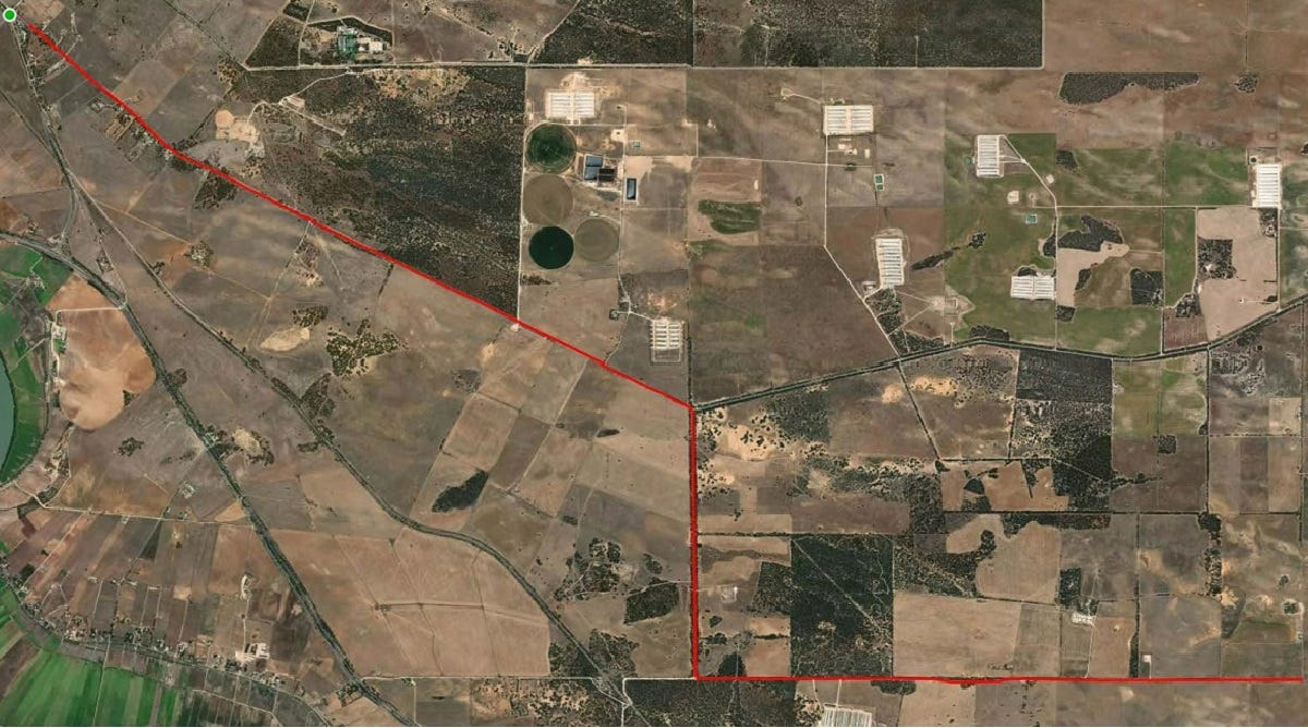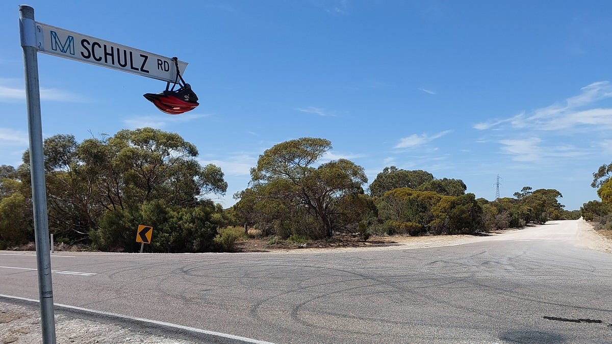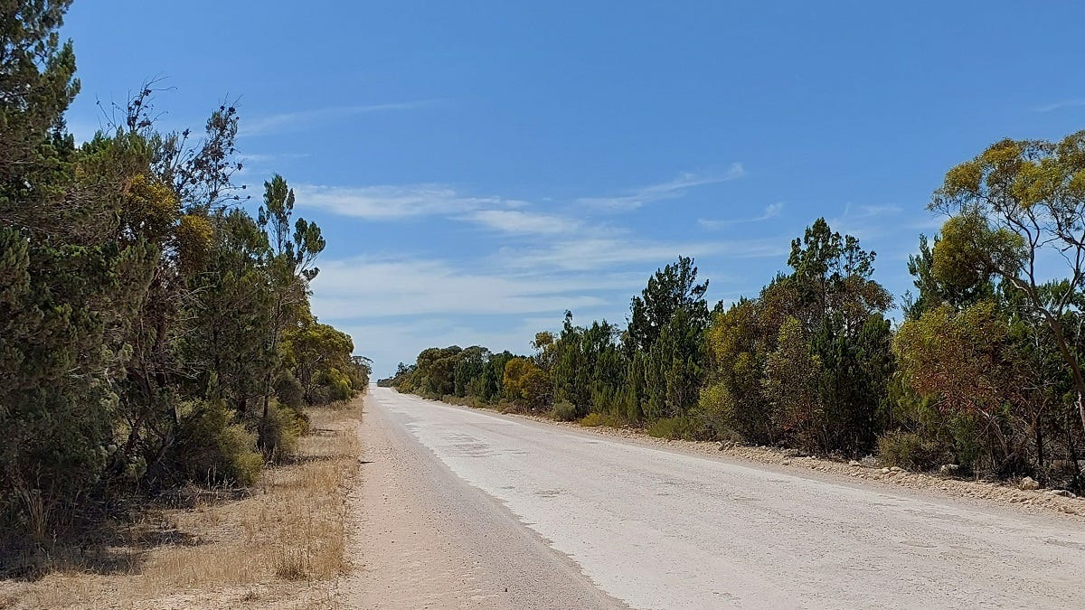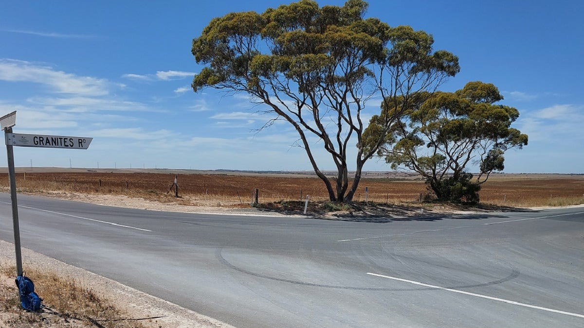 At the 6km point of riding Orland Road, the intersection of the bitumen Granites Road that leads directly into Tailem Bend comes into view.