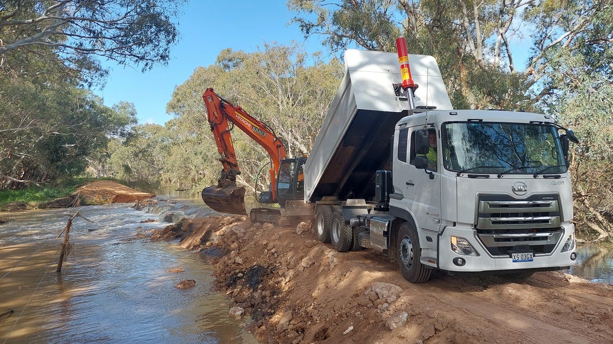 At Pompoota, truck after truck full of rocks and soil reversed carefully out onto the levee to shore up a section 20 to 30 metres long where water had begun flowing over the top onto the Lindner familyâs dairy property.