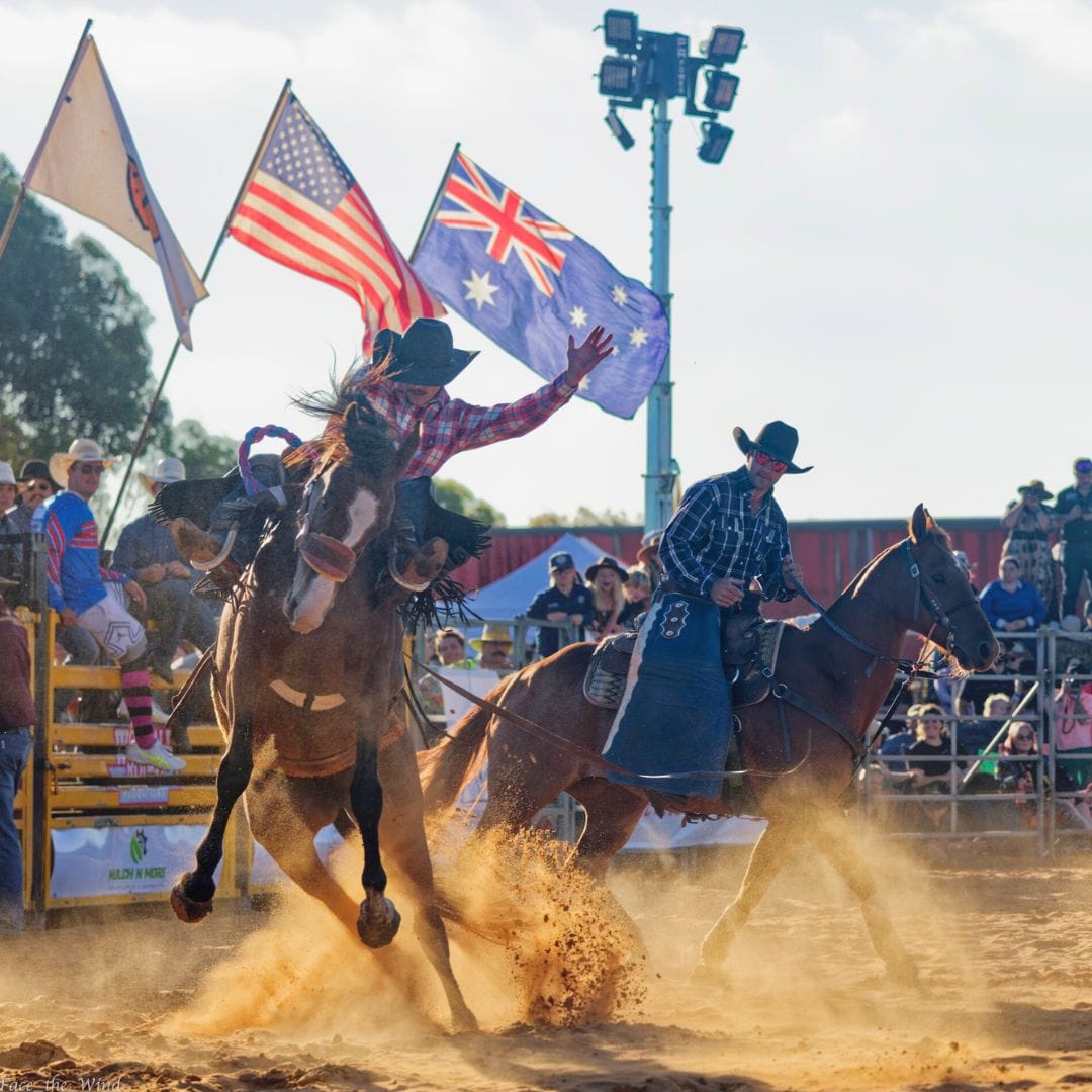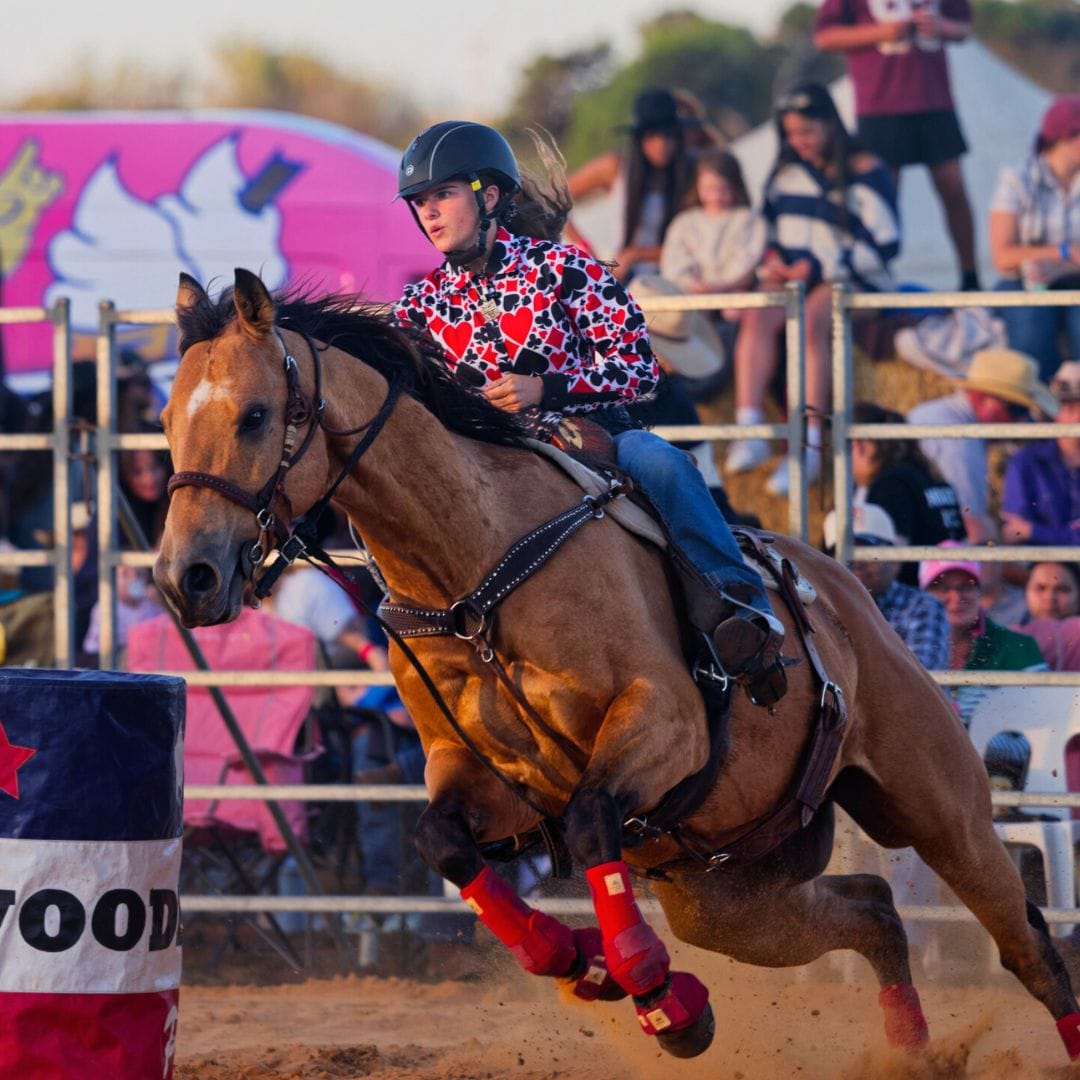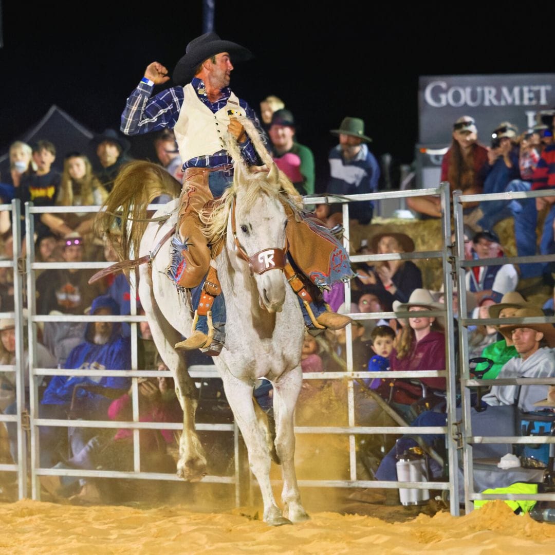 The event, organised by the committee behind the Lower Murray Stockman’s Challenge, featured bull and bronc riding and barrel racing and continued long into the night with a musical performance by Tooch and the Honky Tonk Revue.