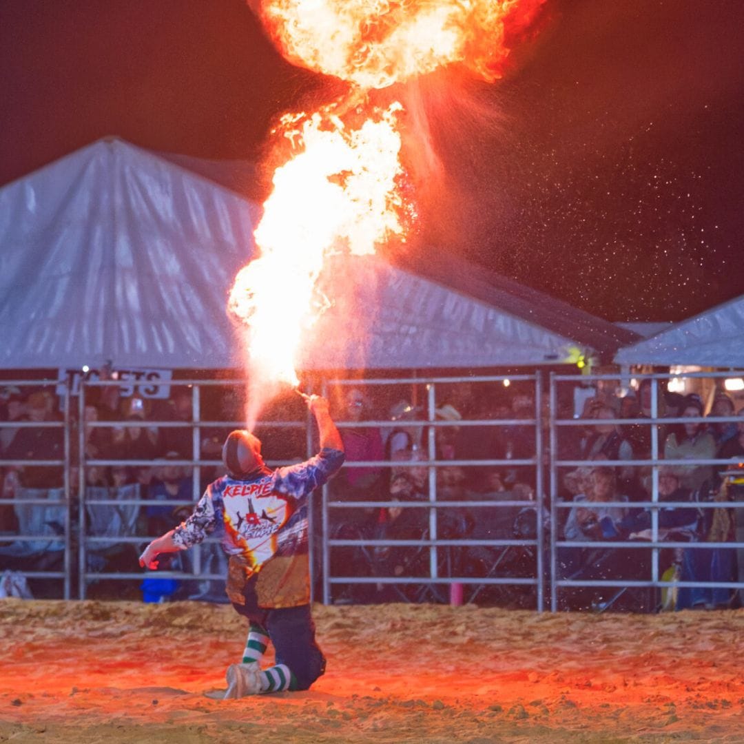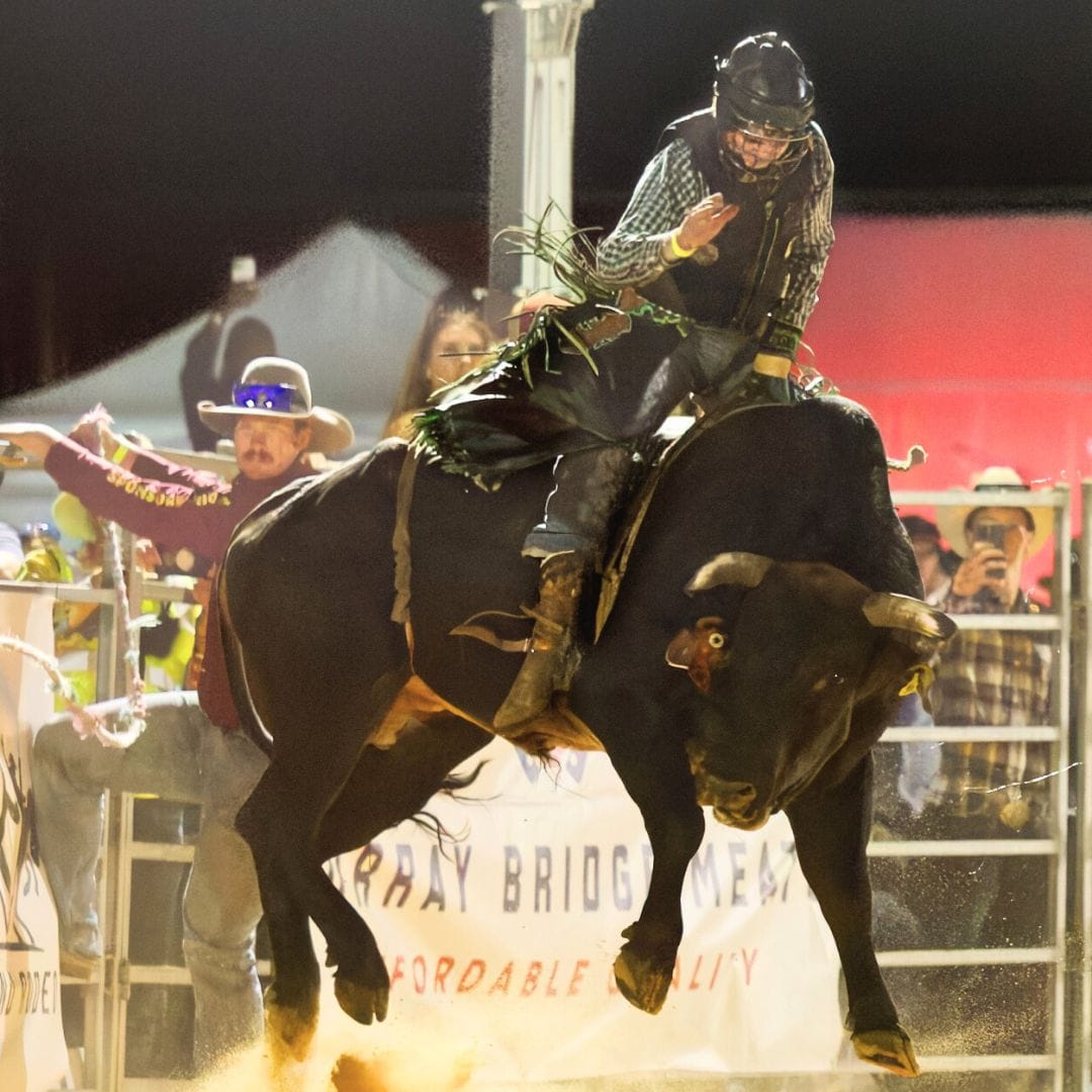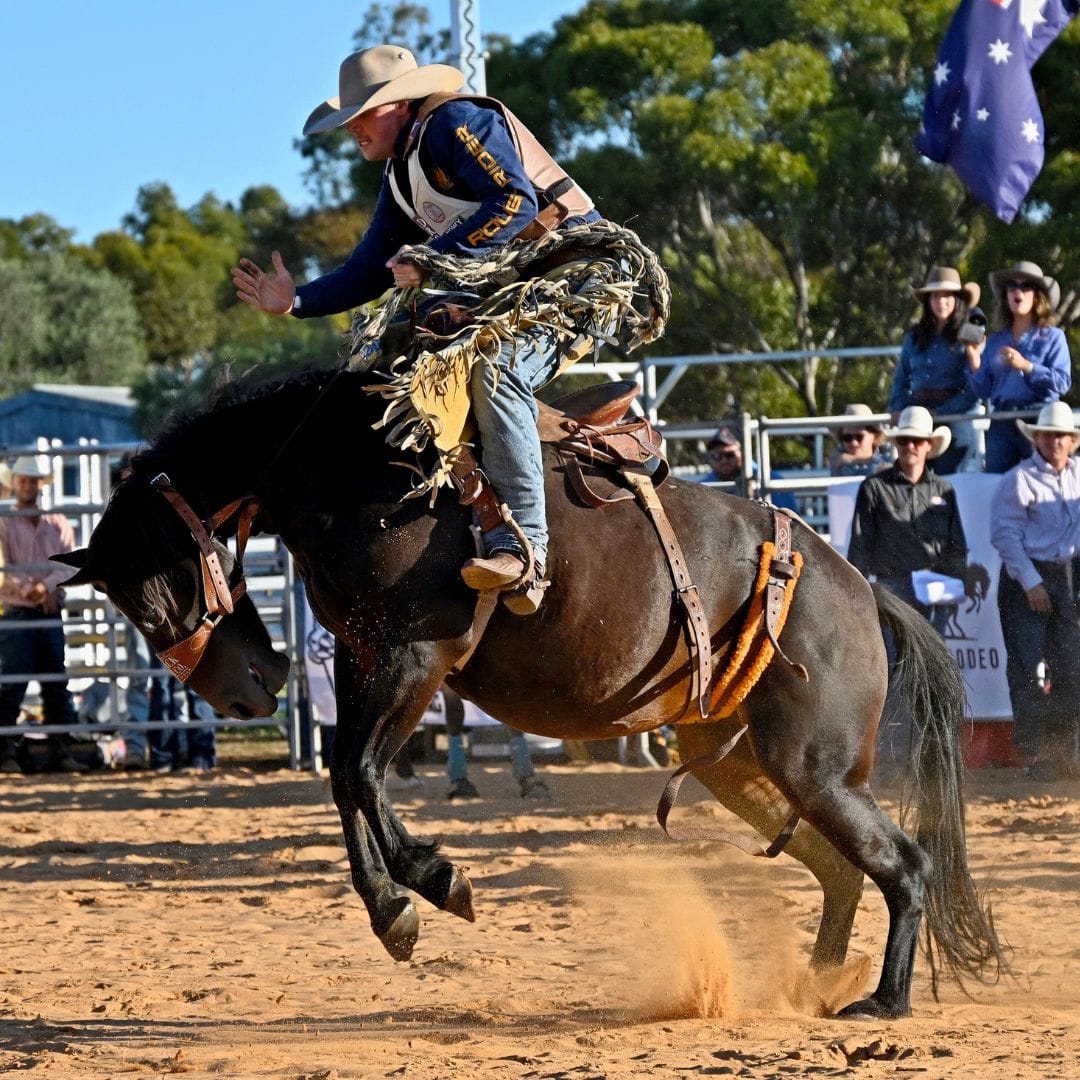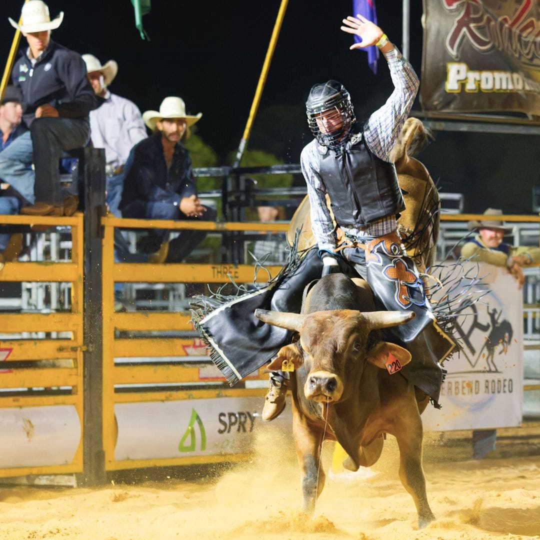 The event, organised by the committee behind the Lower Murray Stockman’s Challenge, featured bull and bronc riding and barrel racing and continued long into the night with a musical performance by Tooch and the Honky Tonk Revue.