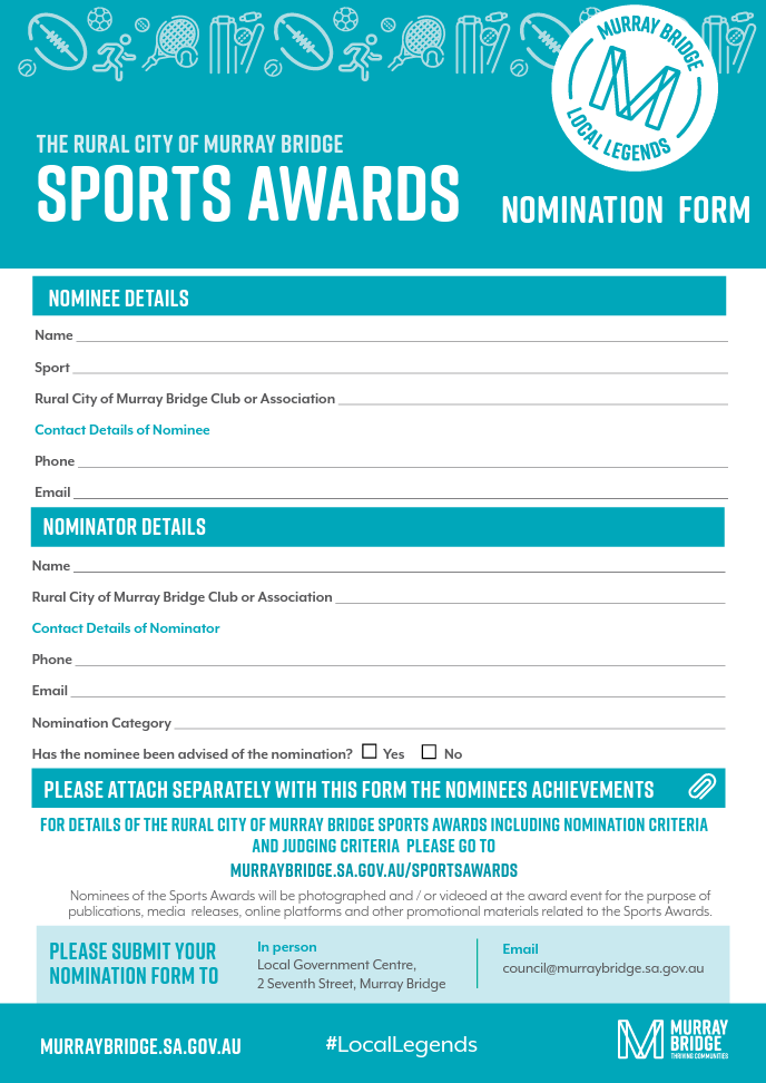 - Nominate an individual or group: Download the nomination form above or visit www.murraybridge.sa.gov.au.
