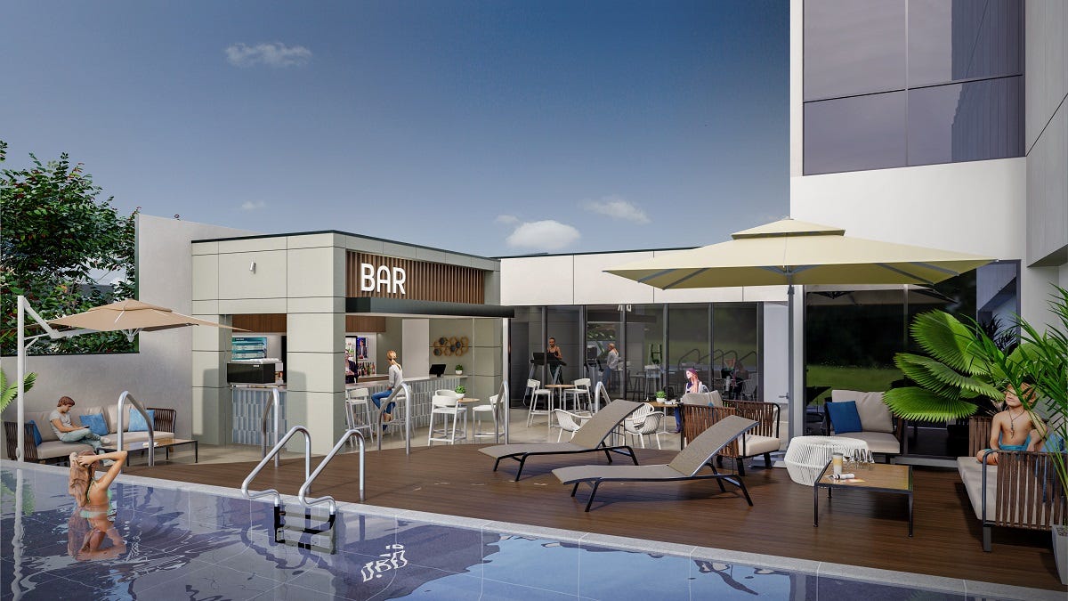 - The Pool Bar, where cocktails will be served beside a heated infinity pool overlooking the river