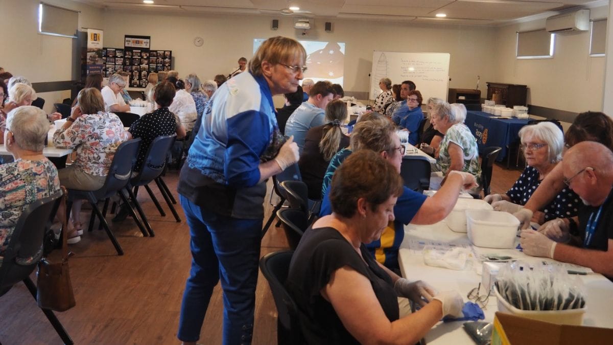 More than 60 volunteers representing 10 local groups – including Rotary Clubs, the University of the Third Age and Sunshiners – took the time to assemble the kits last Tuesday.