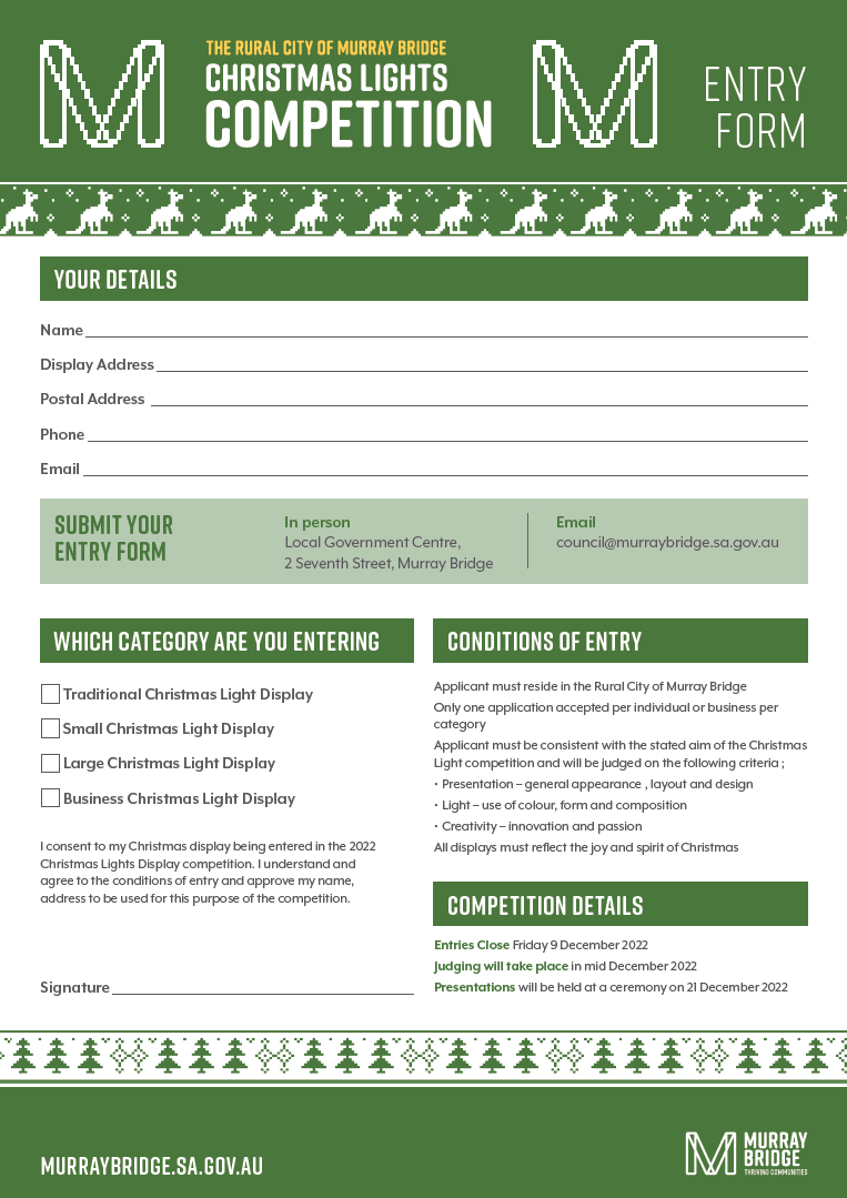 - Enter the 2022 Murray Bridge Christmas lights competition: Download the entry form below, complete it and submit it to council@murraybridge.sa.gov.au, or the council office on Seventh Street, by December 2. Paper copies of the form are available at the Murray Bridge council office and library.