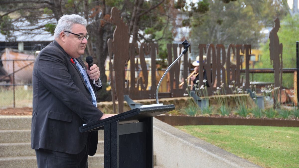 Greg O'Brien speaks at the service and Mick Loeckenhoff lays a wreath. Photos: Peri Strathearn.