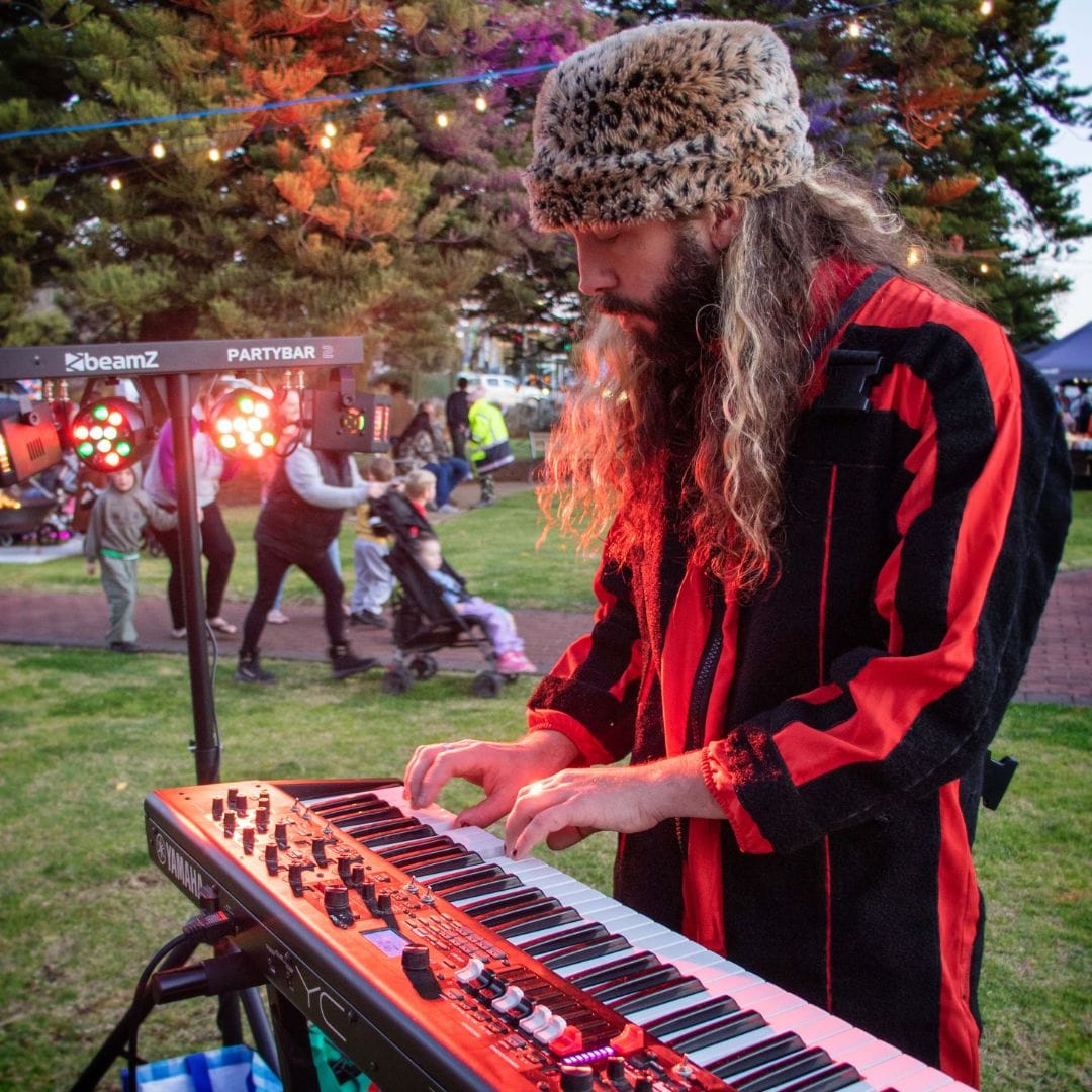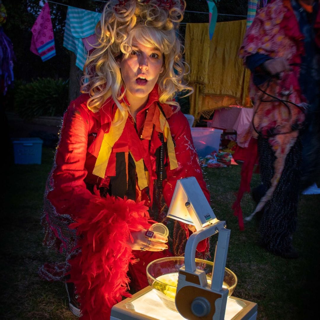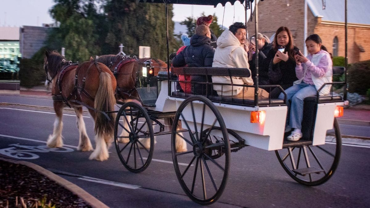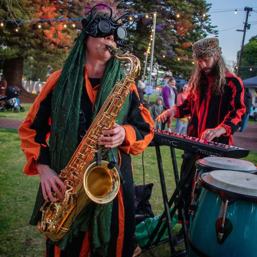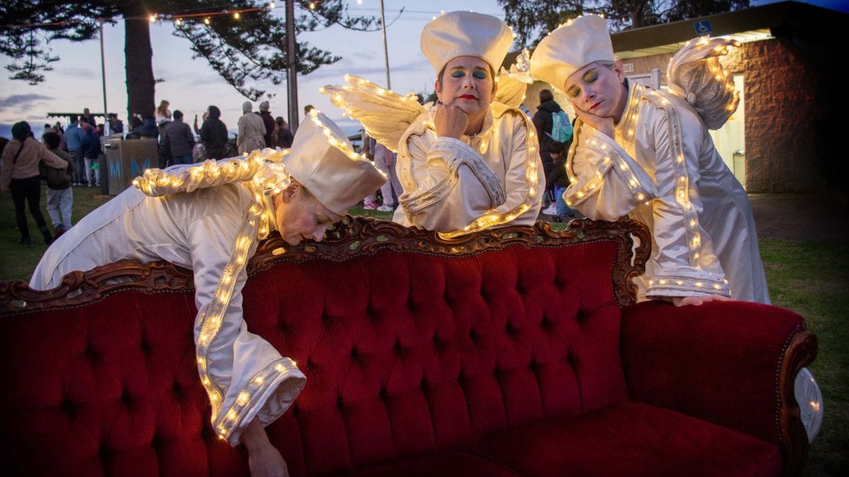 Space Travellers from Bait Fridge; light angels; Brittany Trueack from Bait Fridge; Venessa Leigh and David Male; Zorin Vujic and the horse and carriage. Photos: Glenn Power