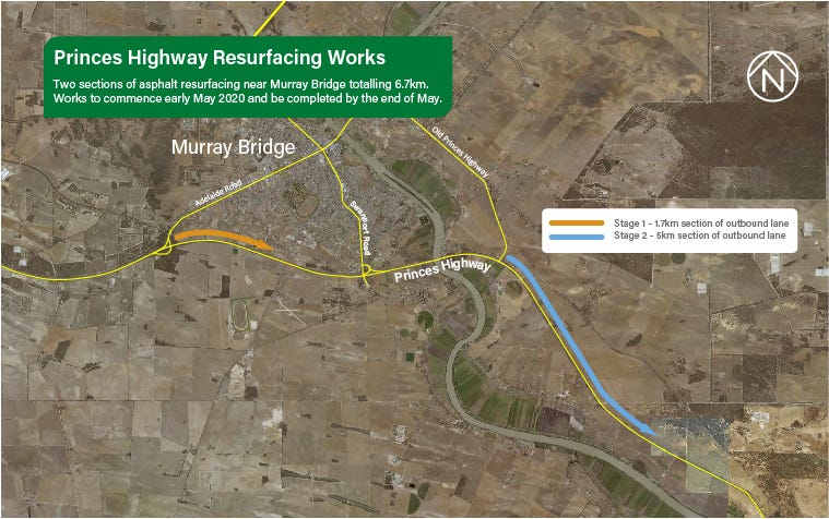 Workers will improve the road surface on at two locations over the coming weeks: a 1.7-kilometre section of the freeway just past the Adelaide Road, Murray Bridge exit; and a 5km stretch beyond the Murray Bridge East exit.