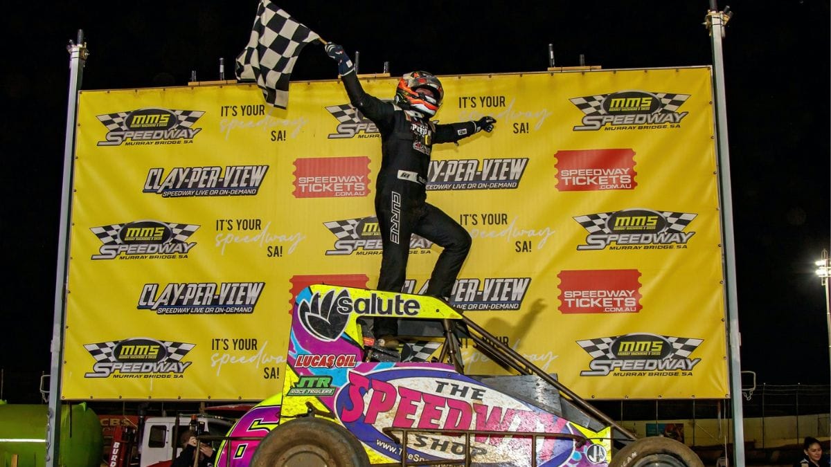 Kaleb Currie has raced to a stunning victory in the 50-lap feature of the Australasian Speedcar Championship in Murray Bridge on Easter Sunday.