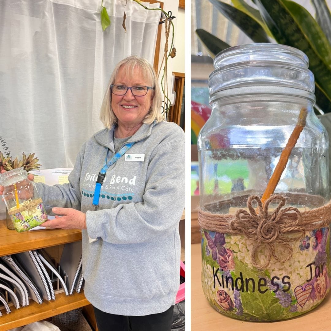 Educator Angela Mason proudly showing the Kindy Kindness Jar and the relaxation spot after lunch. Photos: TB Kindy.