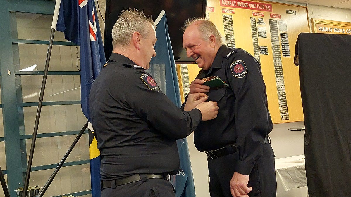 Mr McArdle recalled that confronting summer on Sunday, as he and 33 other volunteers from the SA CFS’ Swanport Group were awarded the National Emergency Medal.