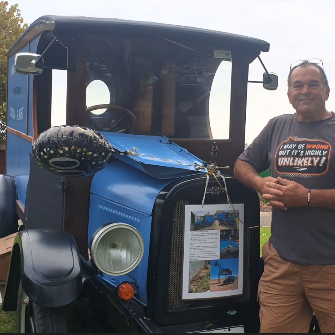 The history of the car is his dad’s family history on the driver’s side of the truck and his mum’s family history on the passenger side of the truck, as both families were market gardeners.