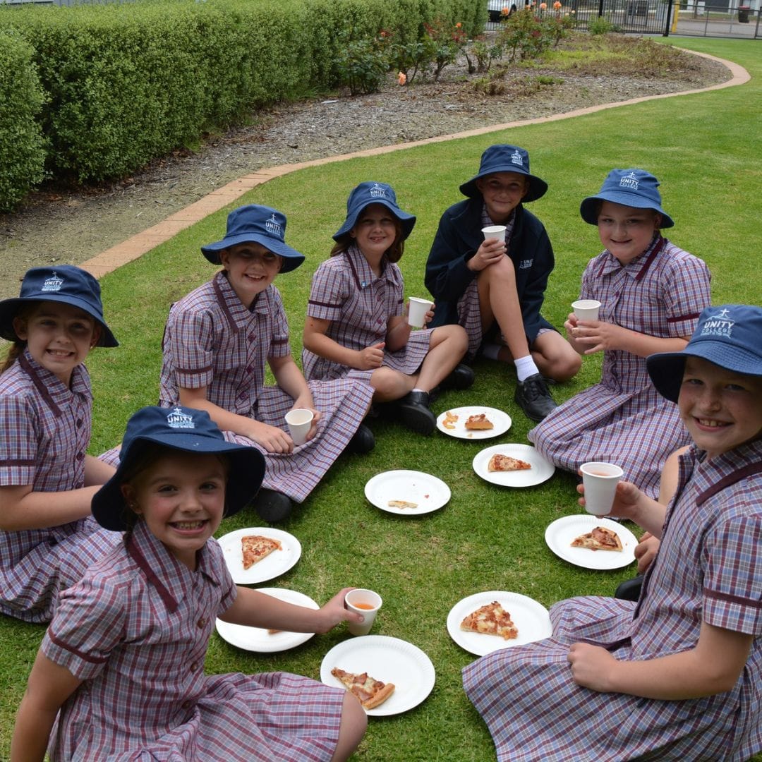 Chelsea and her classmates celebrated with pizza after she was presented with a set of colouring pencils by Mr Pasin.