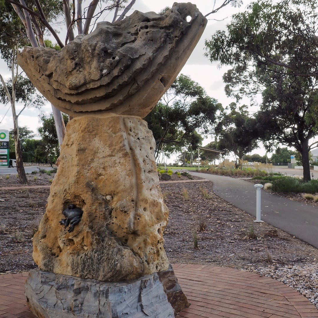 Adjacent to Cromwell Road sits an imposing sandstone and limestone sculpture entitled Water’a’Plenty, described on the plaque as “a monument to the joy felt by all the inhabitants and co-habitants of the River Murray catchment area when, after each drought, life-giving waters again flow freely toward the sea”.