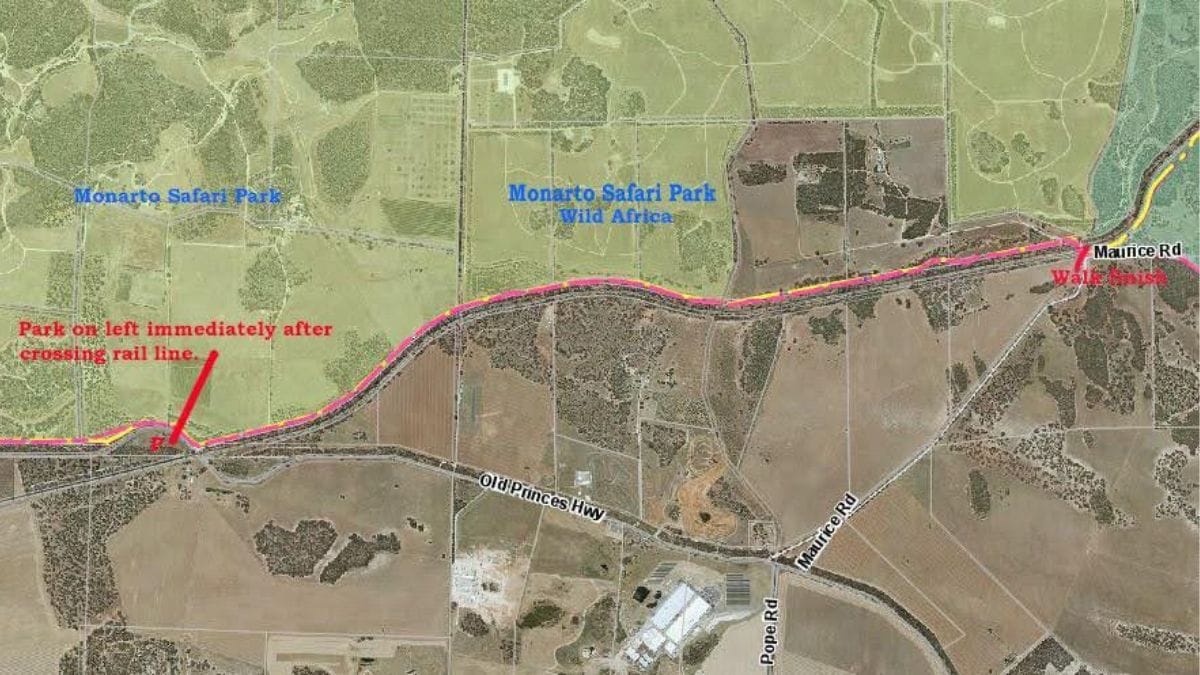 If you have two cars, leave one at the car park on Maurice Road near the rail crossing – “walk finish” on the map – then continue to the start of the walk via Maurice Road and Old Princes Highway.