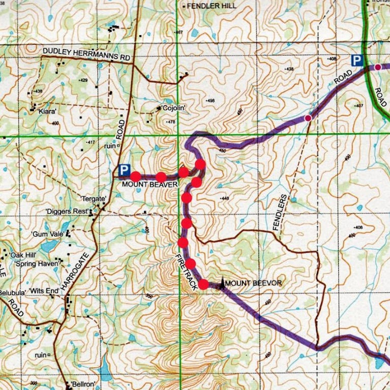 The trail to the summit is marked by red dots overlaid on Lavender Federation Trail map two, pictured above, but is also shown on map one; both are available from the Murray Bridge Visitor Information Centre on South Terrace.