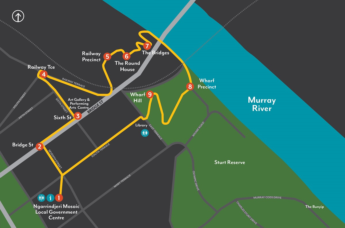 Our start point, marked 1 on the map, is at the Ngarrindjeri mosaic and mural at the local government centre.