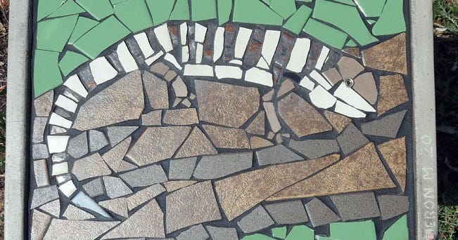 It then meanders across an open area displaying small mosaics of native animals mounted on pedestals before crossing a section of water on a board walk, onto dry land in front of houses overlooking the lagoon.