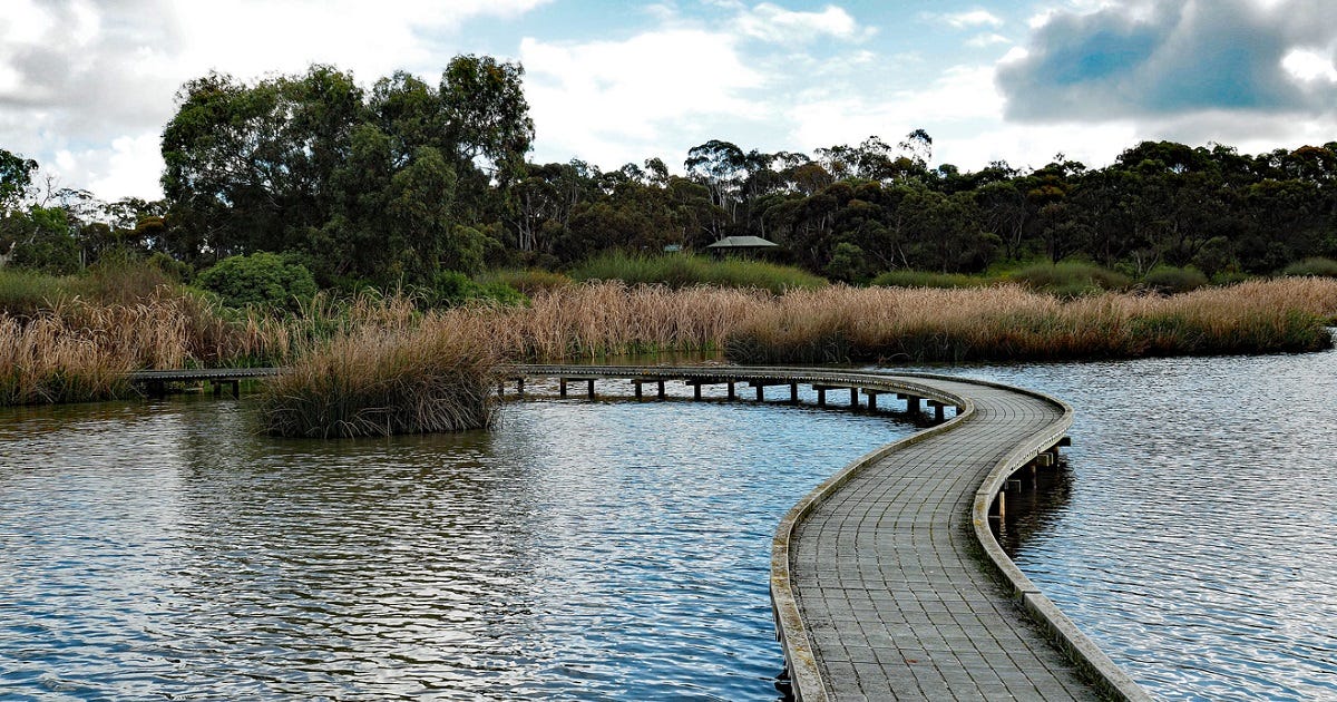 The elevated interpretive centre provides not only information on flora, fauna and a layout of the area but gives a panoramic view over the wetlands with seats to pause, listen and enjoy.