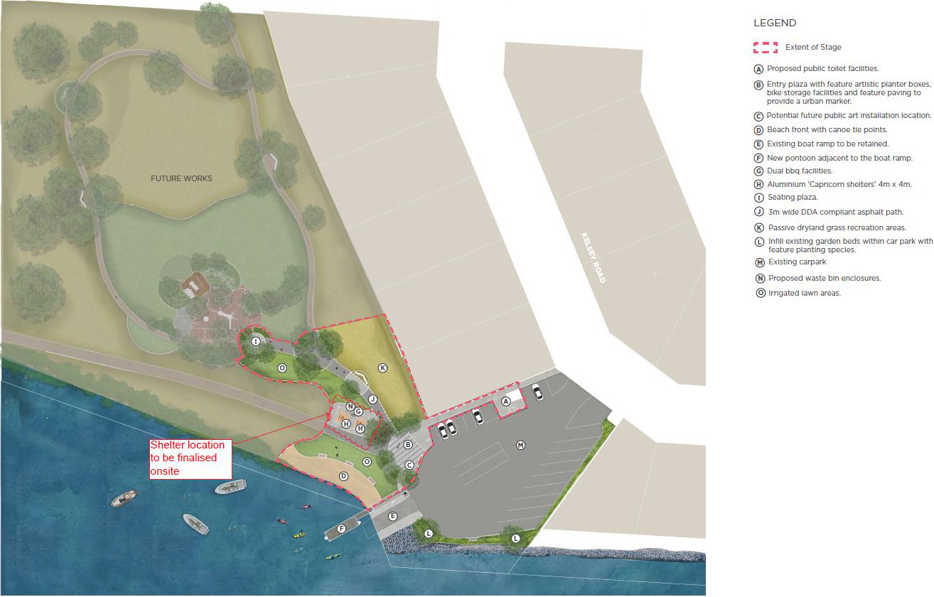 As well as the toilets and barbecues, a first stage of works will include shelters, benches, planter boxes, a bike rack, a path, lawned areas and landscaping.